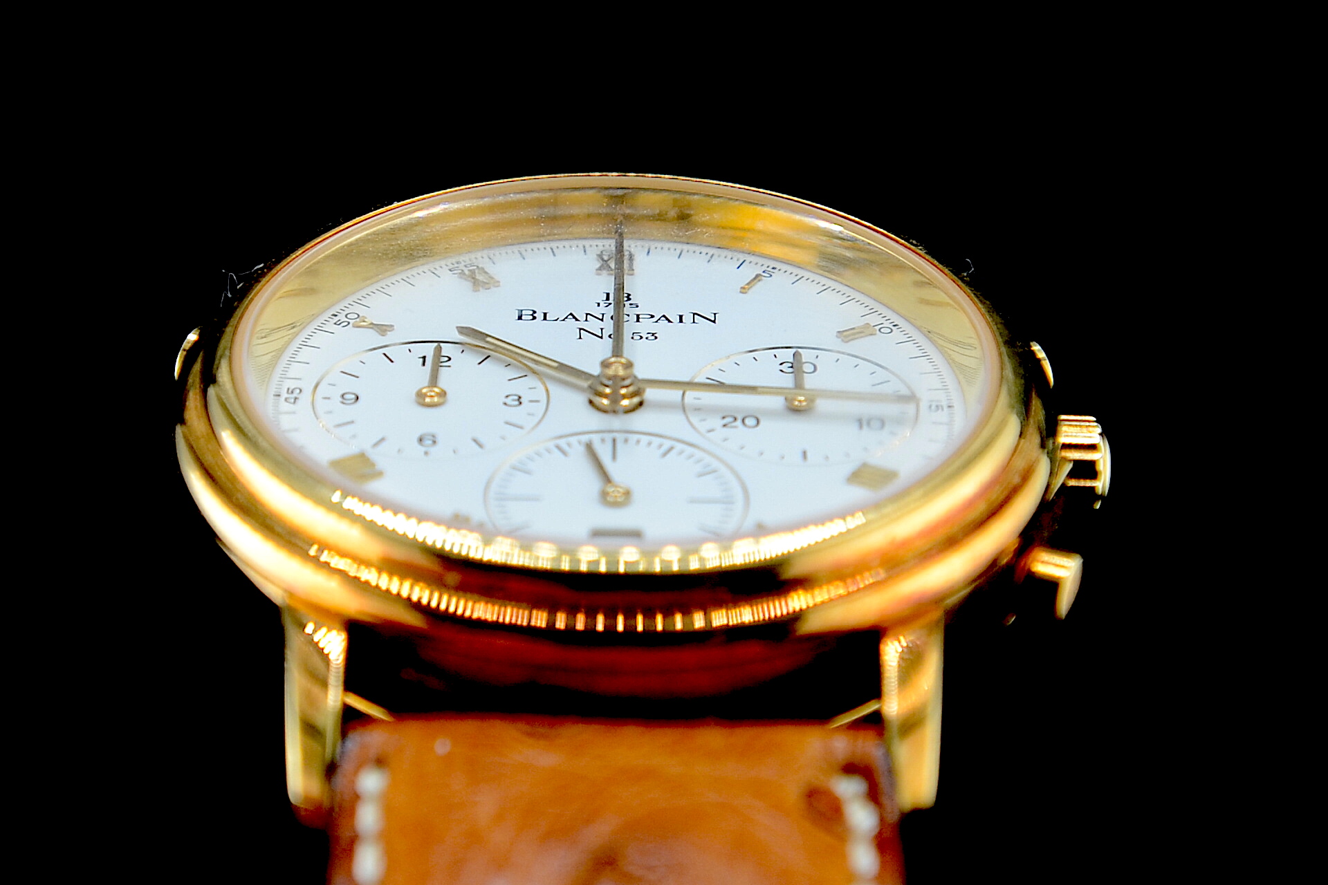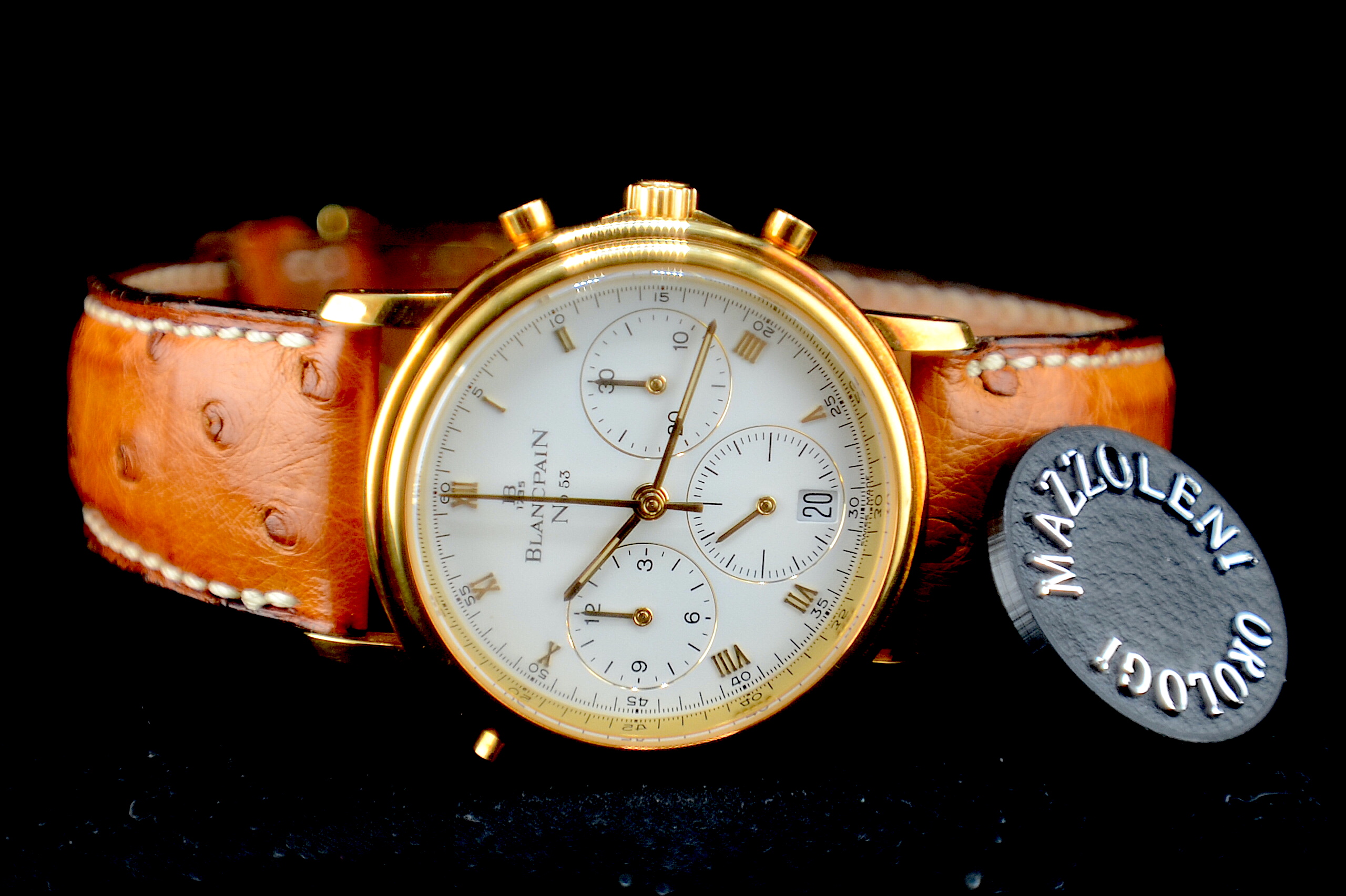 Un capolavoro vintage celebrato come il primo cronografo automatico rattrapante (a rattrapante) al mondo. Alloggiato in una cassa in oro giallo 18 carati da 34 mm, è dotato del movimento ultra sottile calibro 1186 a carica automatica: una meraviglia ingegneristicaerfettamente funzionante, è inoltre dotato del cinturino originale Blancpain in pelle di struzzo e della fibbia in oro giallo 18 carati firmata. Tutte le funzioni dell'orologio funzionano perfettamente e mantengono un buon tempo. HA LA SCATOLA ORIGINALE BLANPAIN E GARANZIA 12 MESI Mazzoleni Orologi