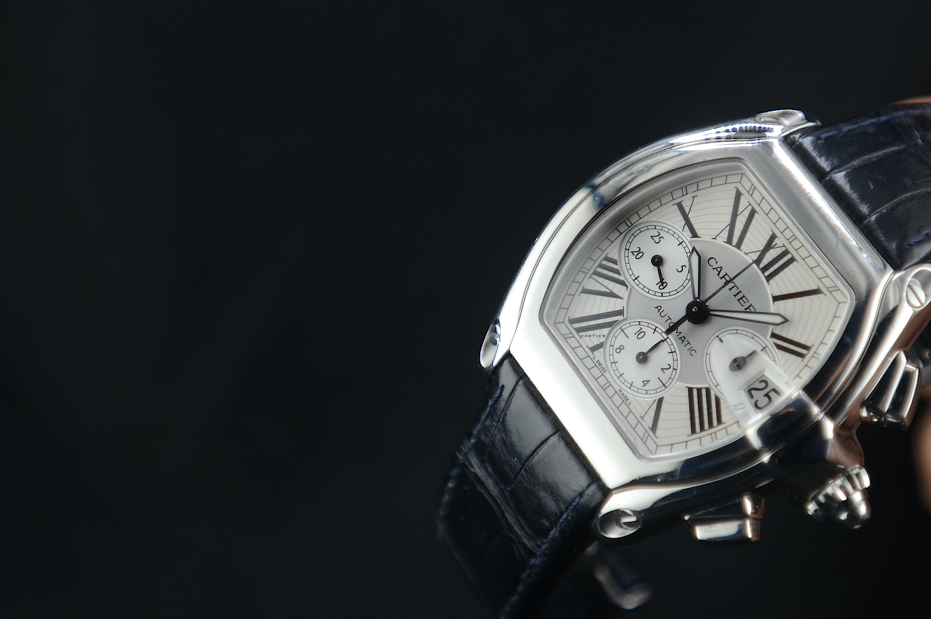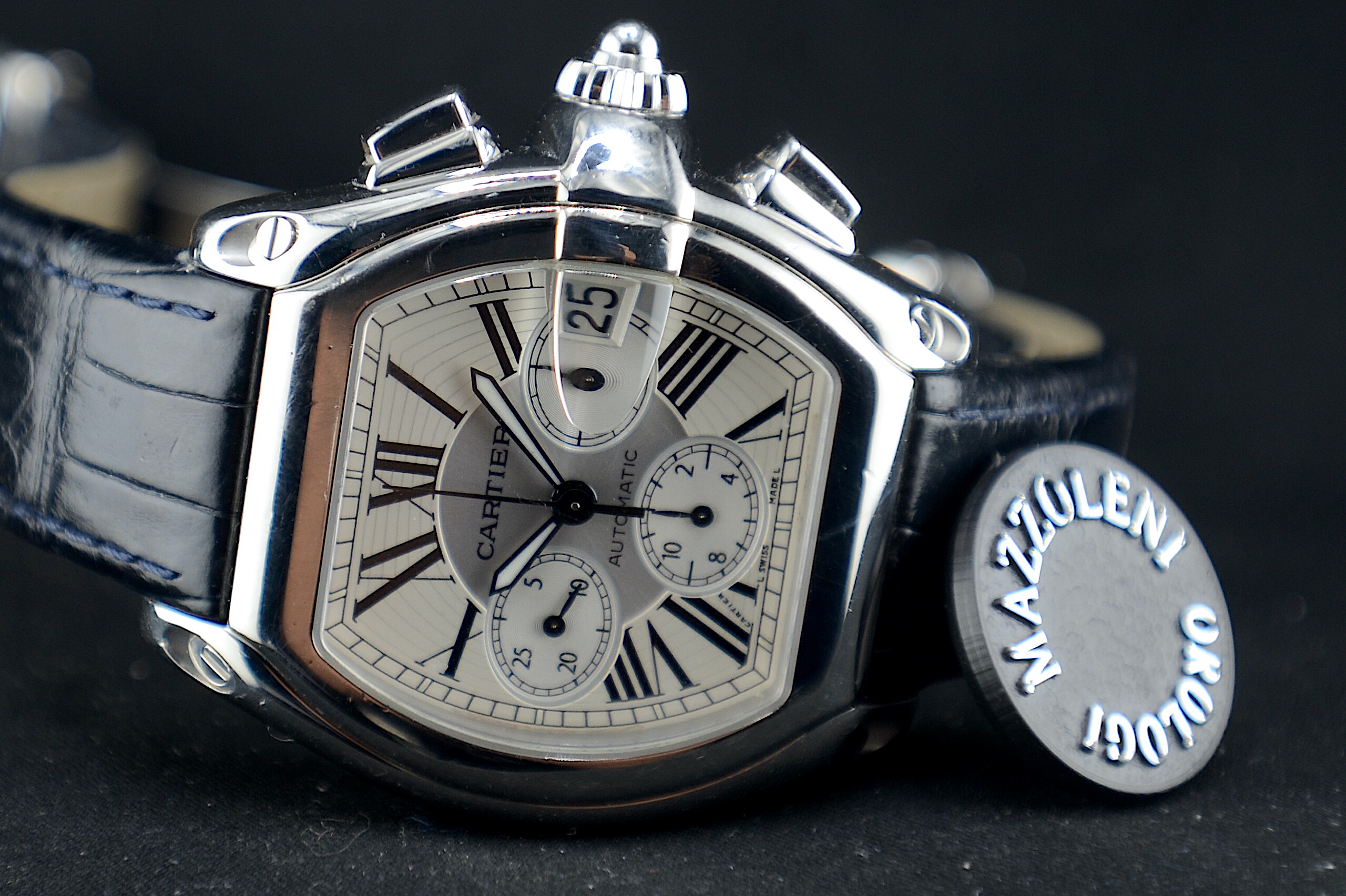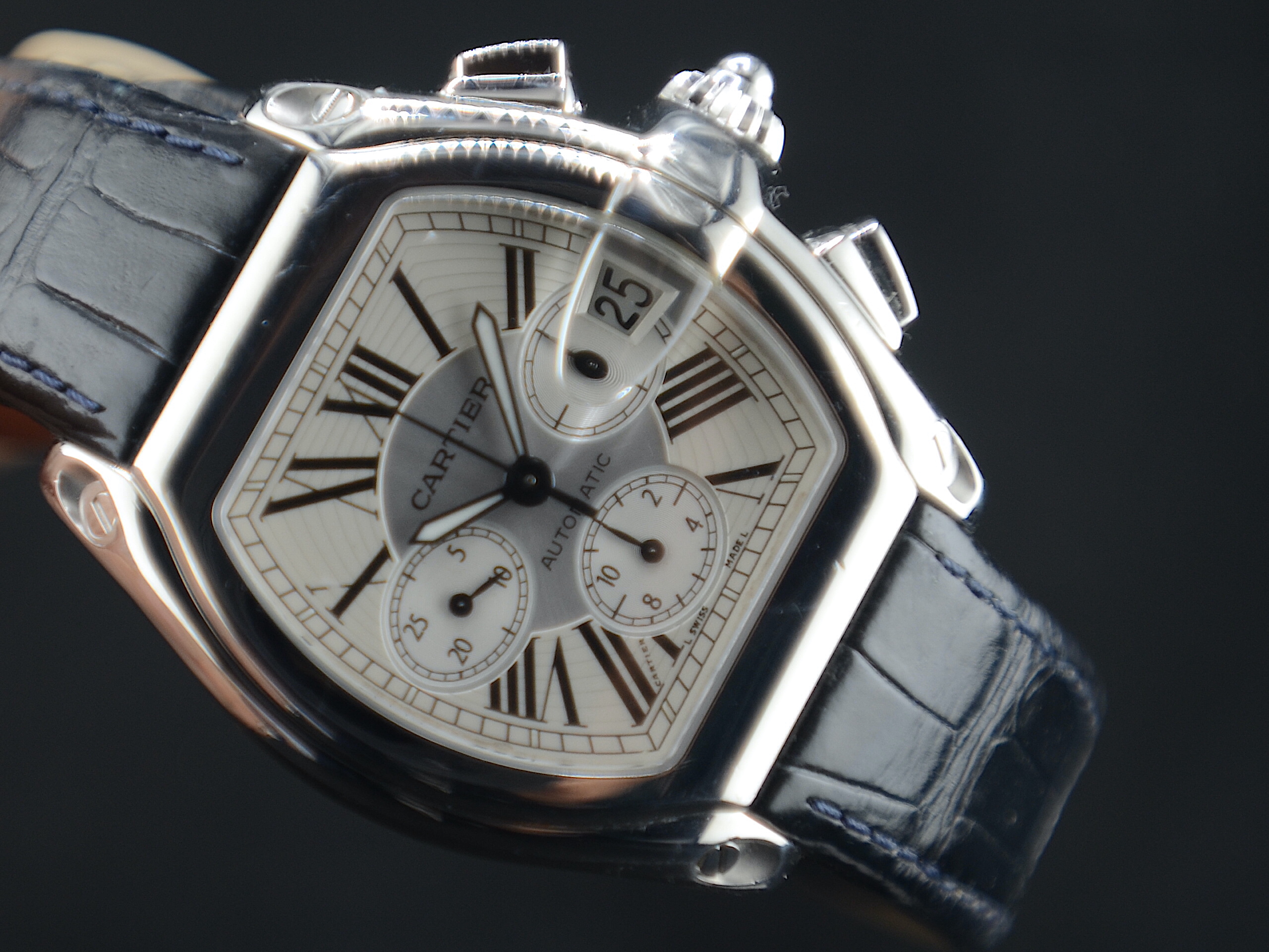 Cartier Roadster XL Chronograph 2618 Automatico.Cassa: ~43 x 38 mm (stile tonneau) Movimento: automatico (ETA 2894-2 modificato) Funzioni: cronografo + dataQuadrante: bianco con numeri romani (classico Cartier) Impermeabilità: circa 100 m Bracciale alligatore con sistema sgancio rapido Cartier orologio con scatola garanzia Mazzoleni Orologi 12 mesi
