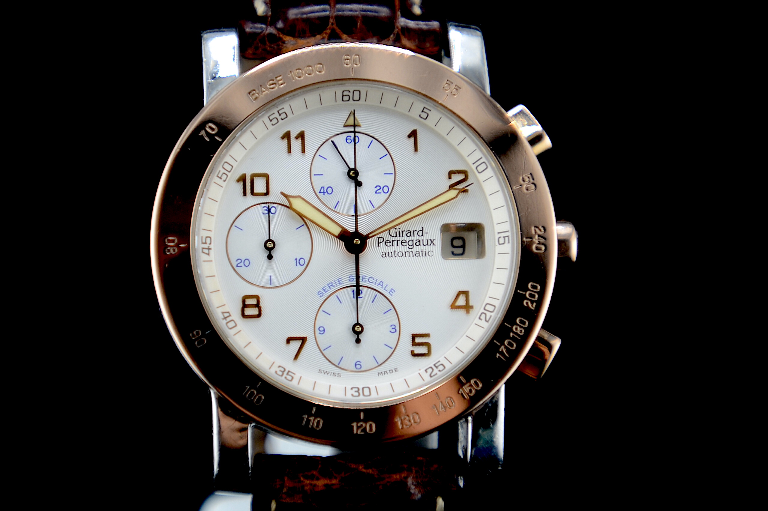 Girard-Perregaux è un marchio di orologi di lusso che ha una lunga storia di eccellenza nella produzione di orologi di alta qualità.La produzione limitata di questo orologio ne fa un vero oggetto del desiderio per gli appassionati e i collezionisti di orologi. Con una quantità limitata di pezzi disponibili sul mercato, possedere un GP 7000 di Girard-Perregaux significa avere un pezzo unico e esclusivo, che conferisce al suo proprietario un'aura di prestigio e raffinatezza. Ogni dettaglio di questo orologio è stato curato con la massima attenzione, garantendo una qualità senza compromessi e un'estetica irresistibile. : questo RARISSIMO GP 7000 CASSA IN ARGENTO massiccio ed ORO ROSA QUADRANTE BIANCO fatto in 1000 esemplari Numerati lo rende un orologio da collezione OROLGIO HA SCATOLA ORIGINALE e garanzia mazzoleni orologi 12 mesi