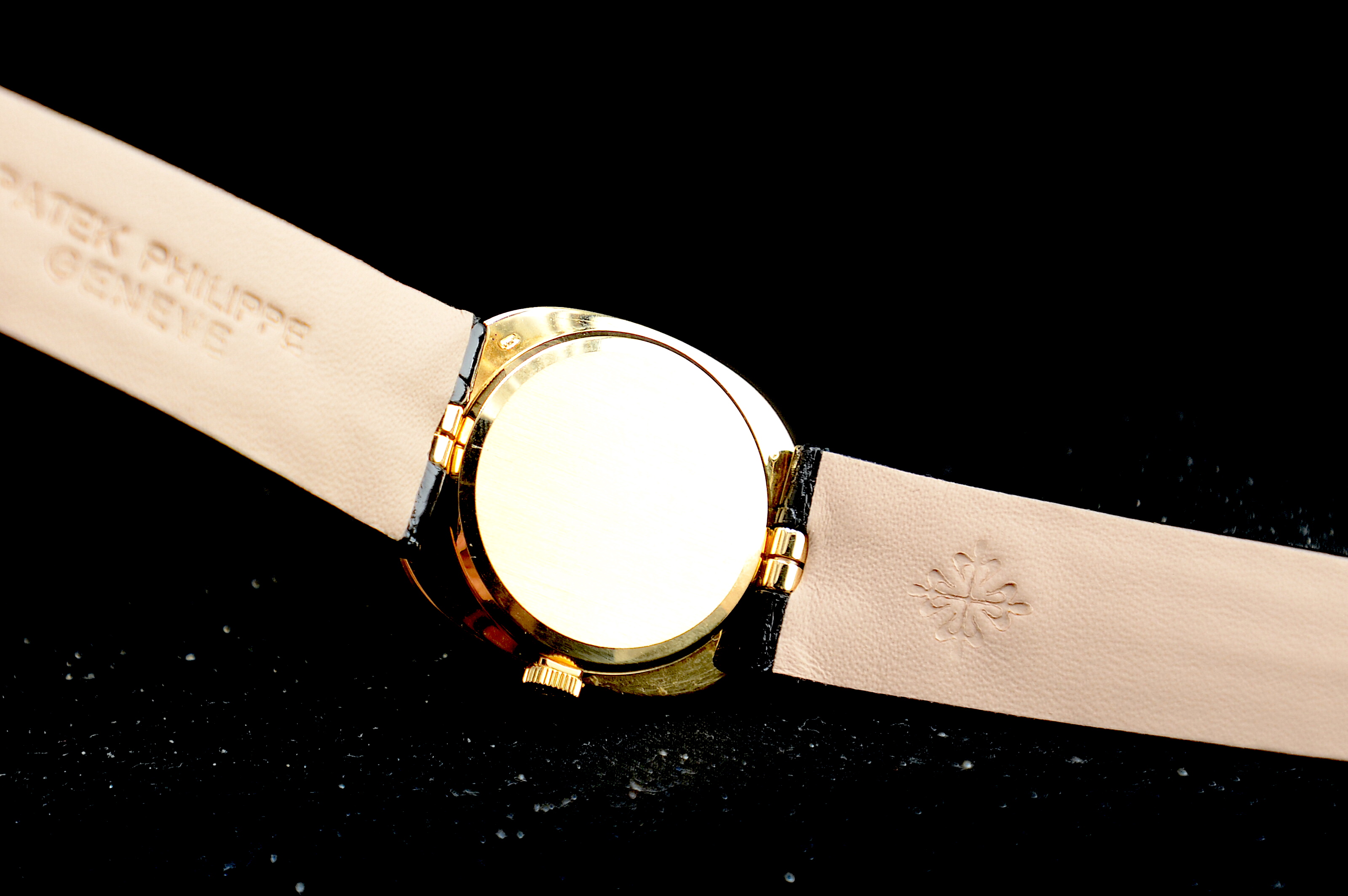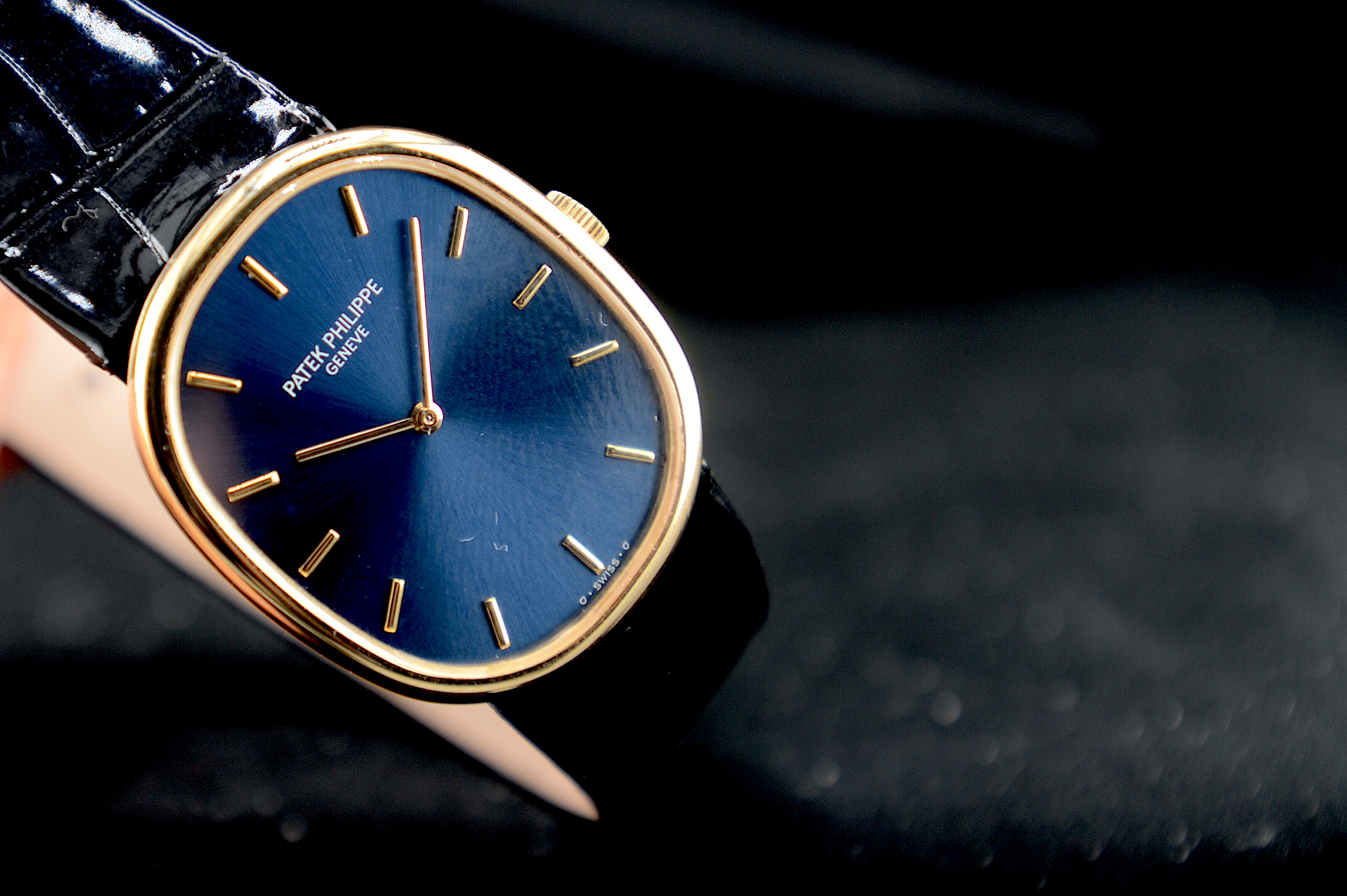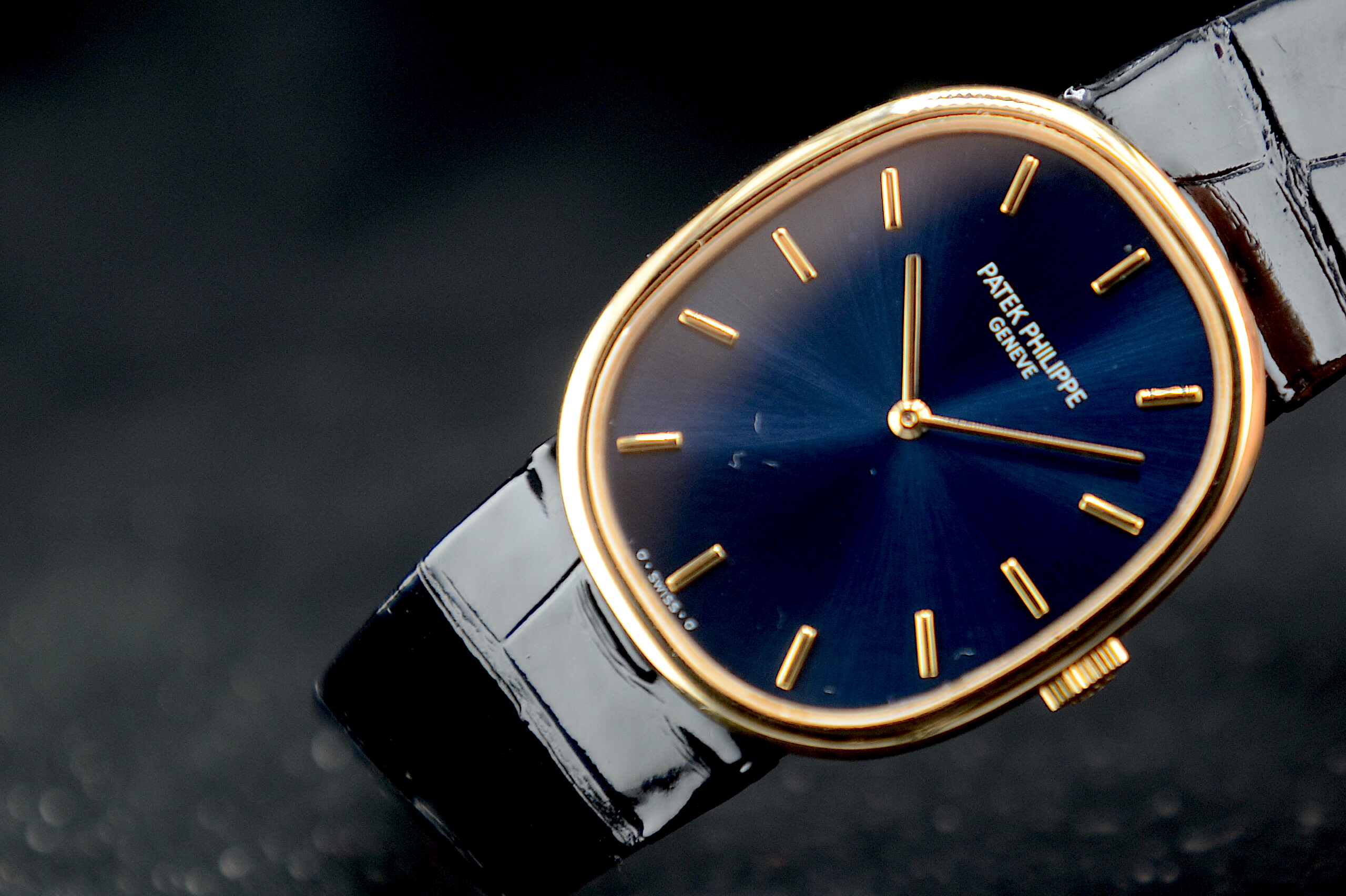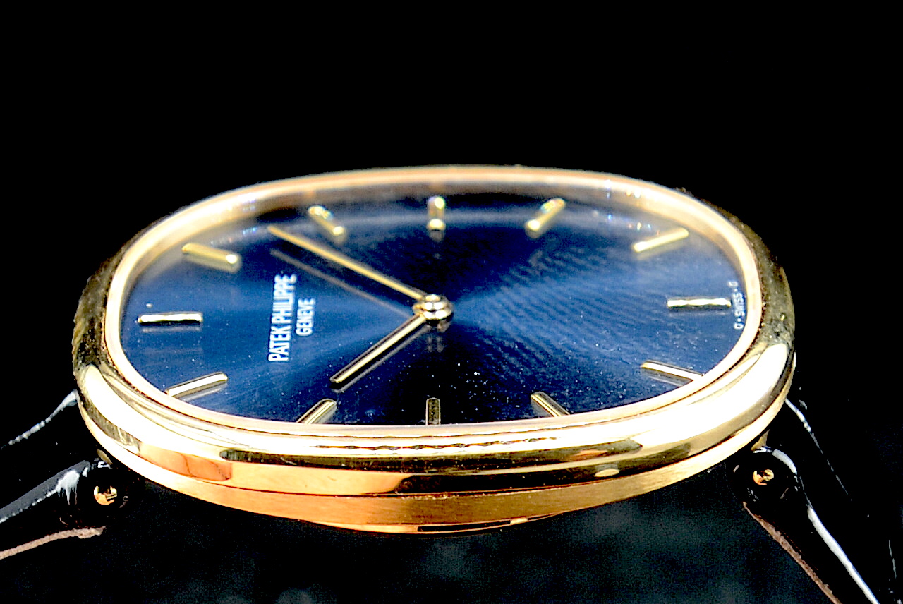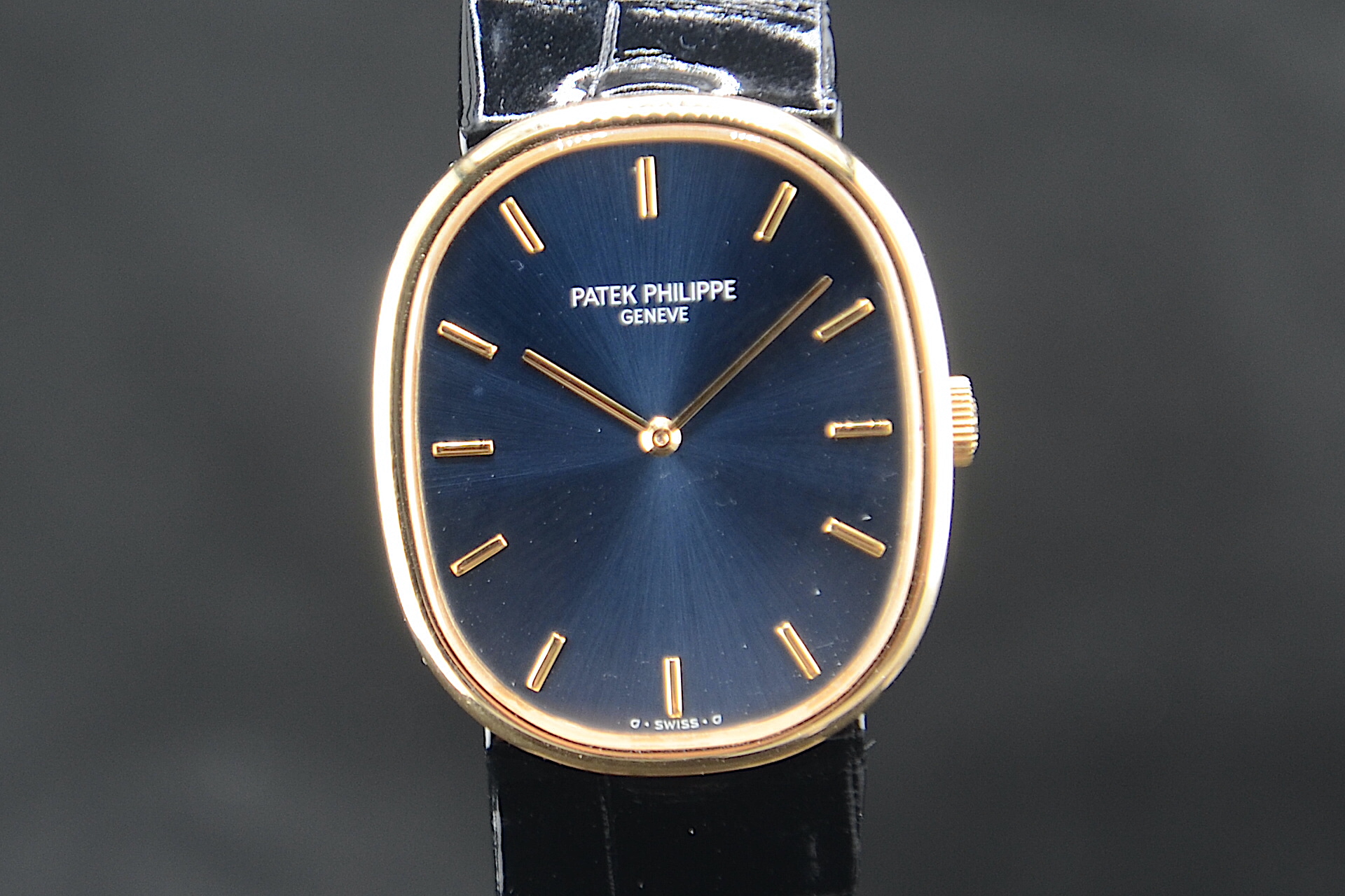 orologio con scatola e garanzia originale full set anno 1996 come nuovo appena revisionato Forma: ellittica (iconica “Ellipse”) Materiale: oro giallo 18 kt Dimensioni: circa 27 × 32 mm, spessore ~5,5–6 mm Fondello: a pressione quadranteSpesso blu soleil (sunburst) o doratoIndici applicati in oro Stile minimalista, senza secondiCalibro Patek Philippe 215Carica manuale ~46 ore di riserva di carica Il Golden Ellipse nasce nel 1968, in un periodo di forte innovazione nel design degli orologi.Unire eleganza classica + design moderno Distaccarsi dalle casse rotonde tradizionaliAnni ‘70–‘90: grande successo come dress watch di lusso Ref. 3848: versione “mid-size”, molto diffusa e versatile (uomo/unisex full set originale Patek Philippe comprende: Scatola originale Certificato di garanzia (importantissimo) Libretti/porta documenti Dal 2021 Patek non rilascia più estratti d’archivio per orologi post-1989, quindi avere il corredo originale aumenta molto il valore