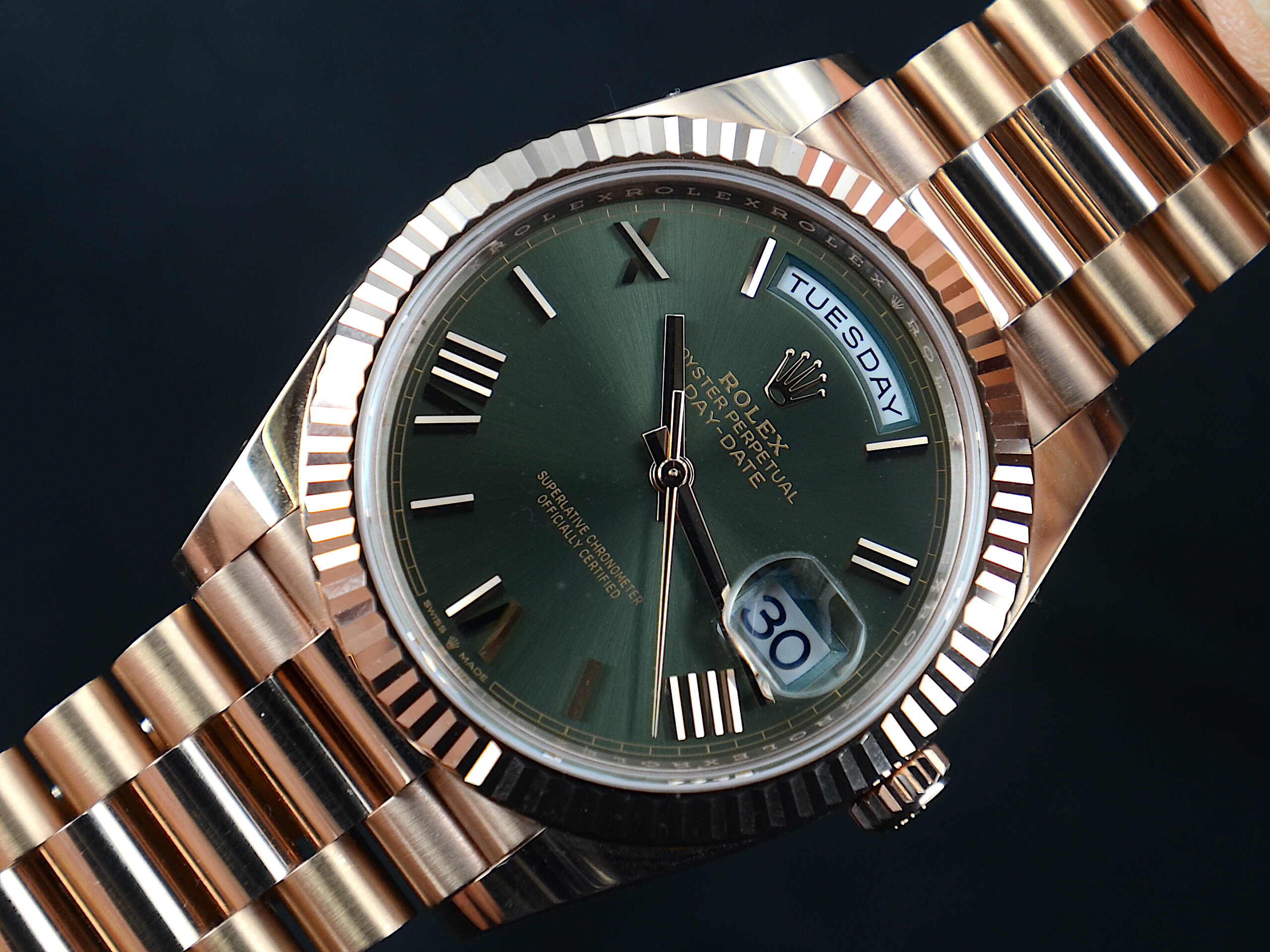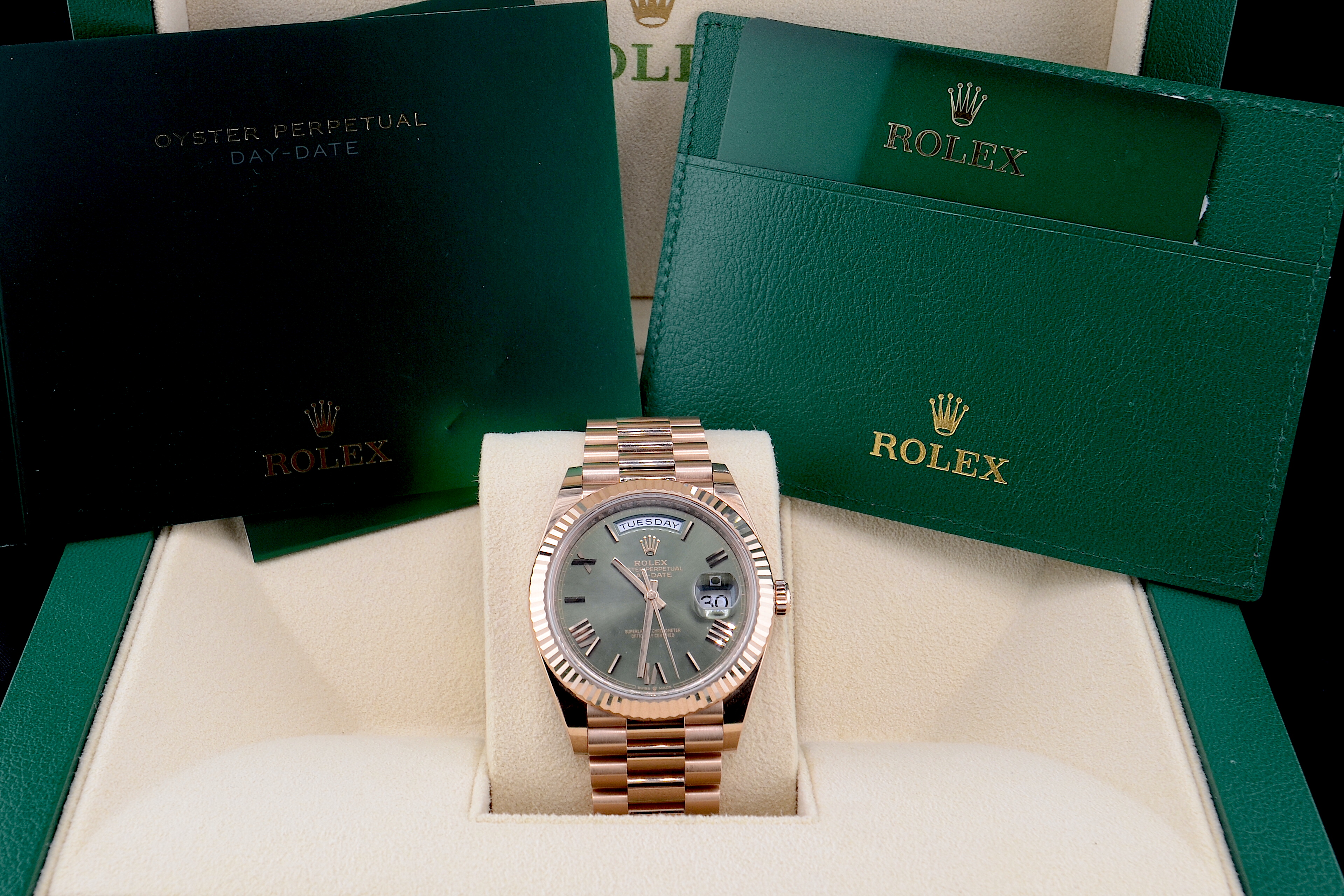 Day-Date 40 Everose Olive Dial full set scatola e garanzia italianaCassa: Oro Everose 18 ct la lega esclusiva di oro rosa di Rolex, sviluppata per mantenere luminosità e calore nel tempo Diametro: 40 mm Quadrante: Olive green (verde oliva) finitura sunray con indici Bracciale: President® in oro Everose con chiusura Crownclasp Movimento: Rolex Calibro 3255 automatico — movimento di manifattura con circa 70 ore di riserva di carica e precisione certificata Cronometro Superlativo Il quadrante verde oliva è una delle varianti più eleganti della ref. 228235 e combina perfettamente con il calore dell’oro Everose, rendendo l’orologio molto ricercato sia dai collezionisti sia da chi cerca un segnatempo prestigioso con personalità È considerato uno dei modelli più desiderati della linea Day-Date moderna orologio non per tutti .... per vari fattori ma al polso dal vivo ( non in foto ) tanta roba !!!!!