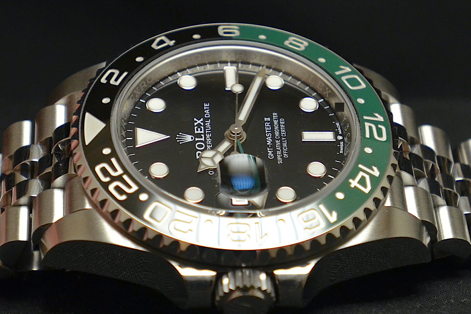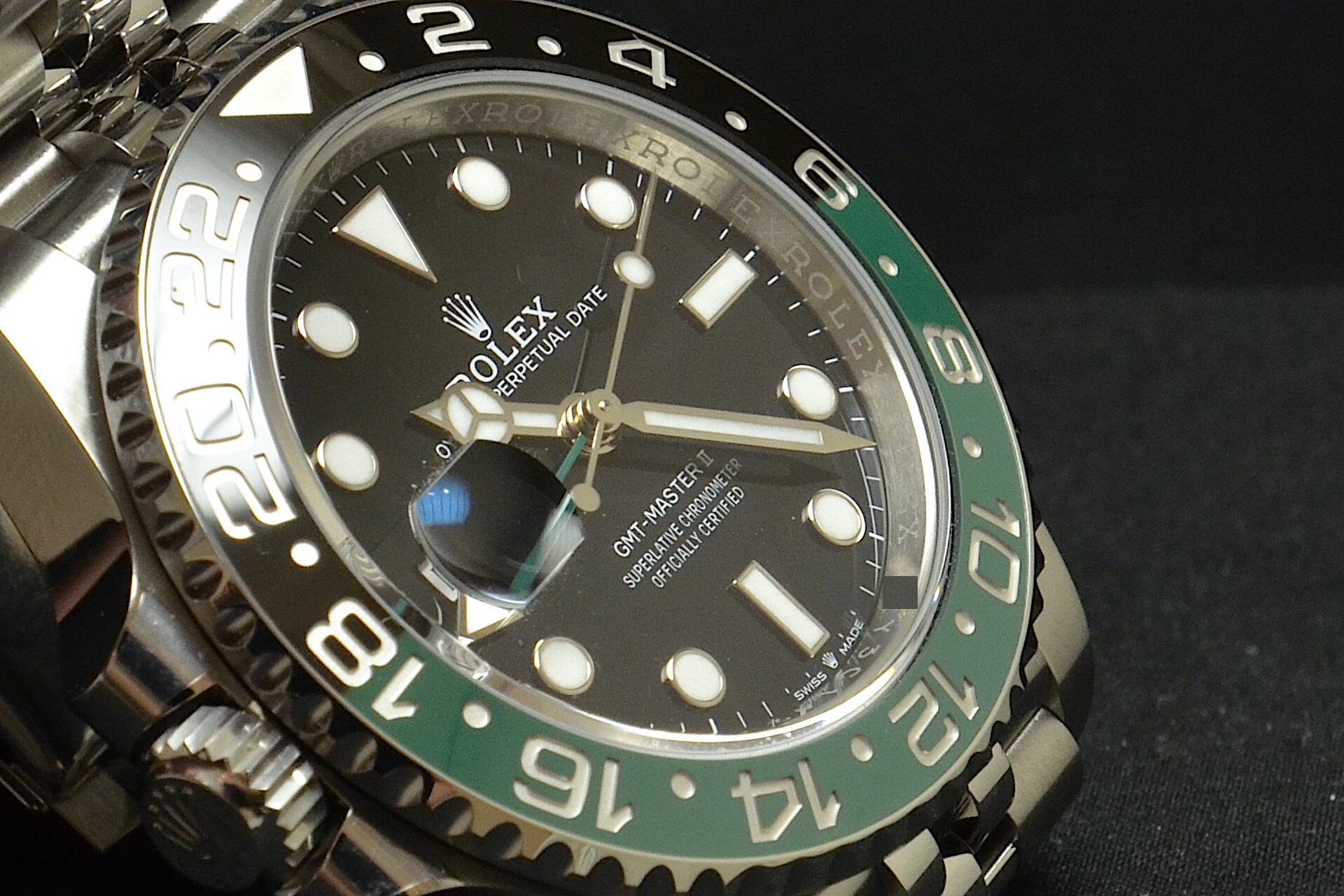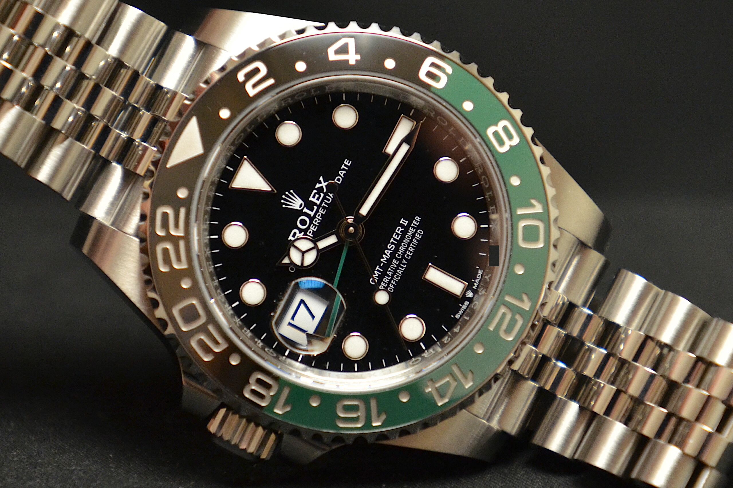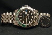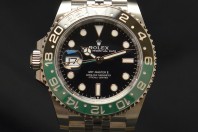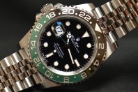 Rolex GMT Master II , anno 2025con scatola e garanzia originali Rolex. Inoltre, con garanzia Mazzoleni Orologi 12 mesi. Questo modello presenta un quadrante nero e un disco della lunetta Cerachrom bicolore in ceramica verde e nera. A completamento delle tradizionali lancette delle ore, dei minuti e dei secondi, il GMT‑Master II esibisce una lancetta supplementare con punta a triangolo che effettua un giro del quadrante in 24 ore, così come una lunetta girevole bidirezionale graduata 24 ore. Questa lancetta 24 ore dal colore intenso indica l’ora di riferimento di un primo fuso orario di origine, leggibile sulla graduazione della lunetta. In viaggio, l’ora locale è indicata sul quadrante tramite la tradizionale lancetta delle ore che può essere regolata con facilità, a salti di un’ora, grazie a un meccanismo comandato dalla corona di carica. La regolazione dell’ora locale avviene in modo indipendente dalla lancetta dei minuti e dei secondi. Ciò permette ai viaggiatori di regolare il nuovo fuso orario senza dover rinunciare alla precisione del loro orologio. Il disco della lunetta Cerachrom è nero e verde, un abbinamento cromatico inedito, esclusivo per questo modello.